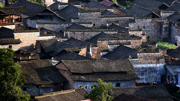 豪俠坪古村背依青山,對麵近處三麵坡田層疊,遠處山巒環繞,山腳與田畈之間溪水潺潺,山如屏障,水似玉帶。鳥瞰古村,環村五座青山形似蛟龍,起伏騰挪,風水行語曰“五龍竄槽”。