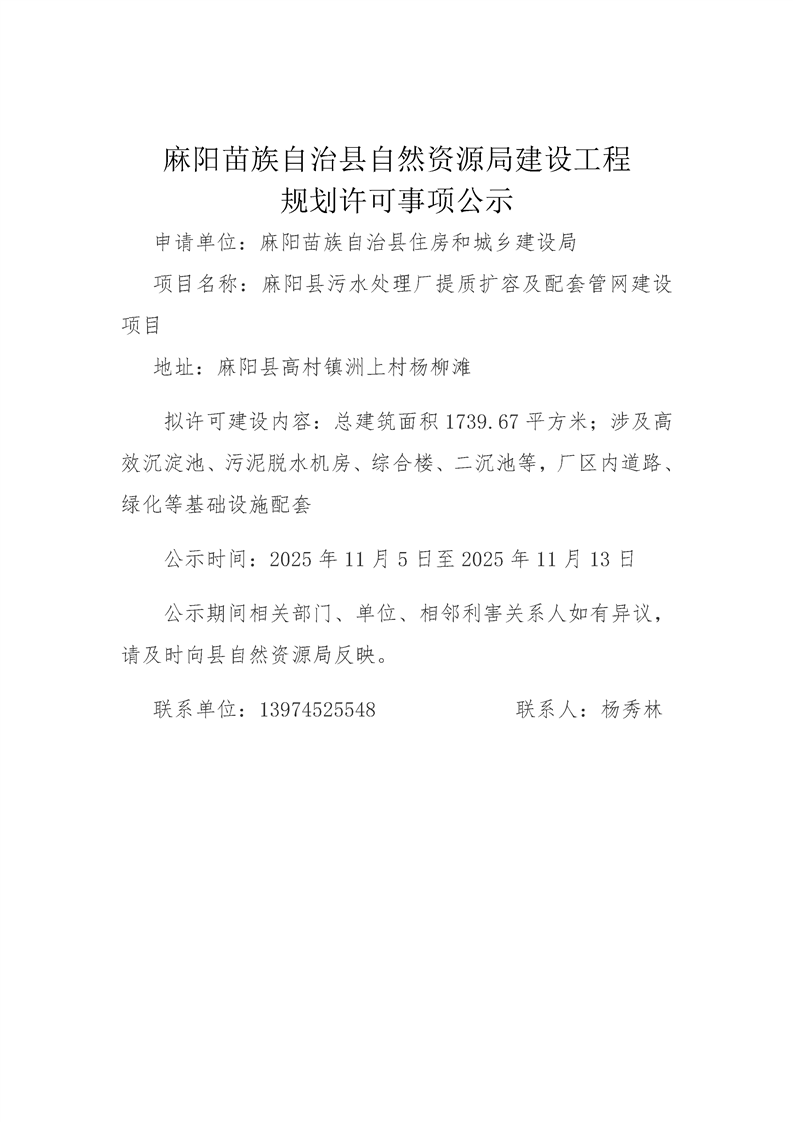 麻陽縣汙水處理廠提質擴容及配套管網建設工程規劃許可公示
