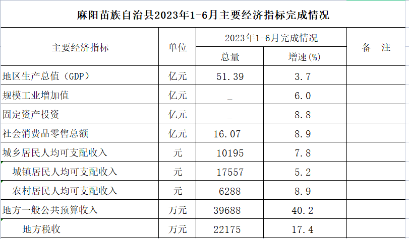 麻陽苗族自治縣2023年1-6月主要經濟指標完成情況