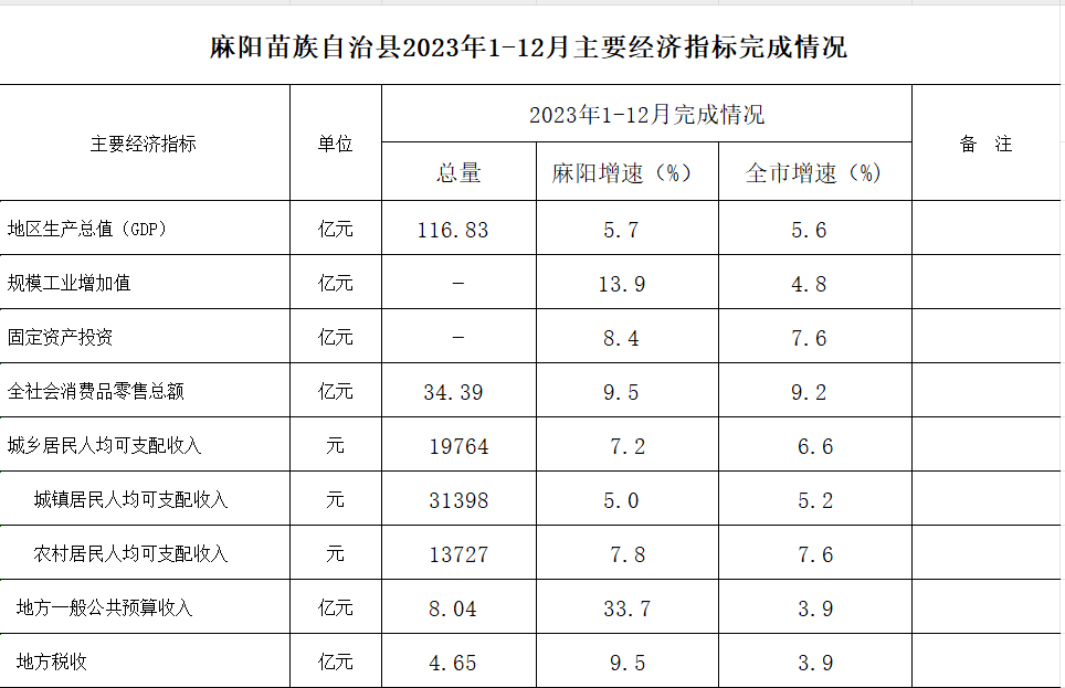 麻陽苗族自治縣2023年1-12月主要經濟指標完成情況