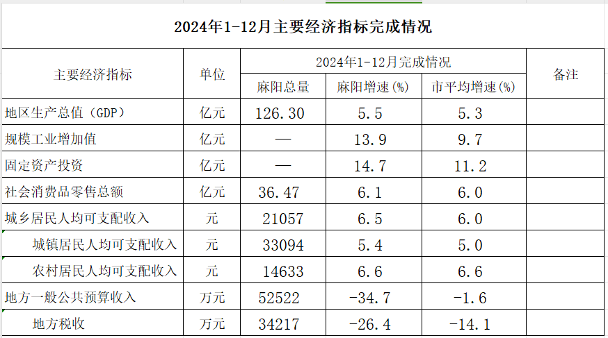 麻陽苗族自治縣2024年1-12月主要經濟指標完成情況