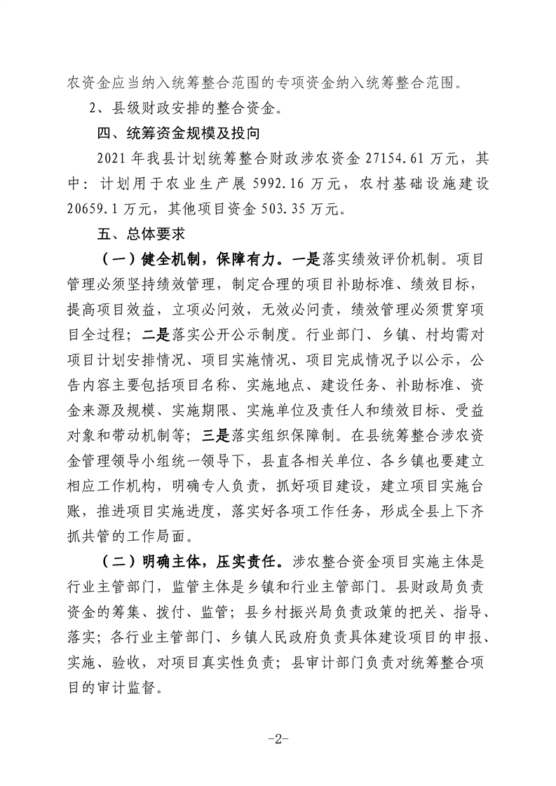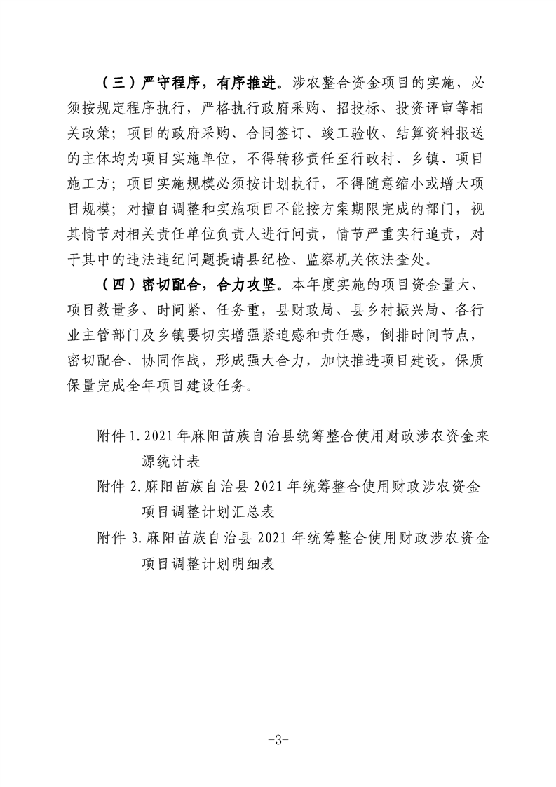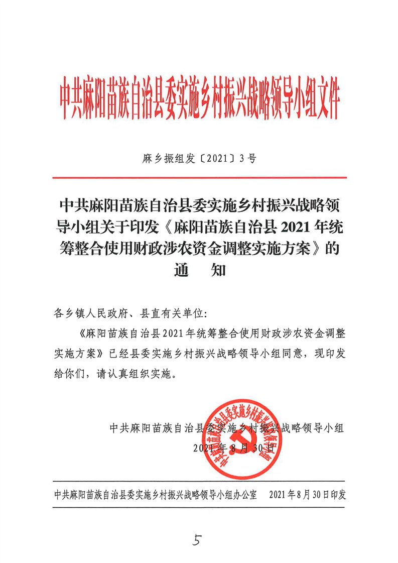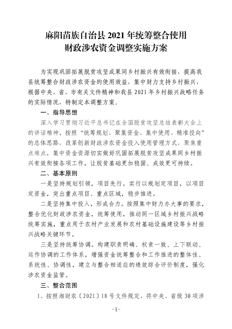 中共麻陽苗族自治縣委實施鄉村振興戰略領導小組關於印發《麻陽苗族自治縣2021年統籌整合使用財政涉農資金調整實施方案》的通知 麻陽苗族自治縣人民政府 https://www.zwgsc.com 發布時間: 2021-09-18 17:05 【字體:大 小】 2021年涉農整合資金調整明細計劃 分享到 來源:麻陽縣財政局 作者: