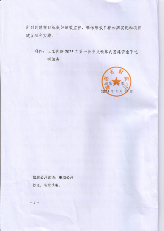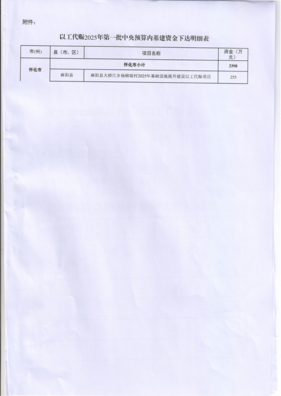 湖南省財政廳關於下達以工代賑2025年第一批中央預算內基建資金的通知 麻陽苗族自治縣人民政府 https://www.zwgsc.com 發布時間: 2025-03-12 16:01 【字體:大 小】 分享到 來源:麻陽縣財政局 作者: