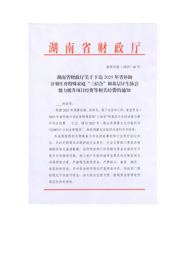 湖南省財政廳關於下達2025年省補助計劃生育特殊家庭“三結合”和基層計生協會能力提升項目經費等相關經費的通知