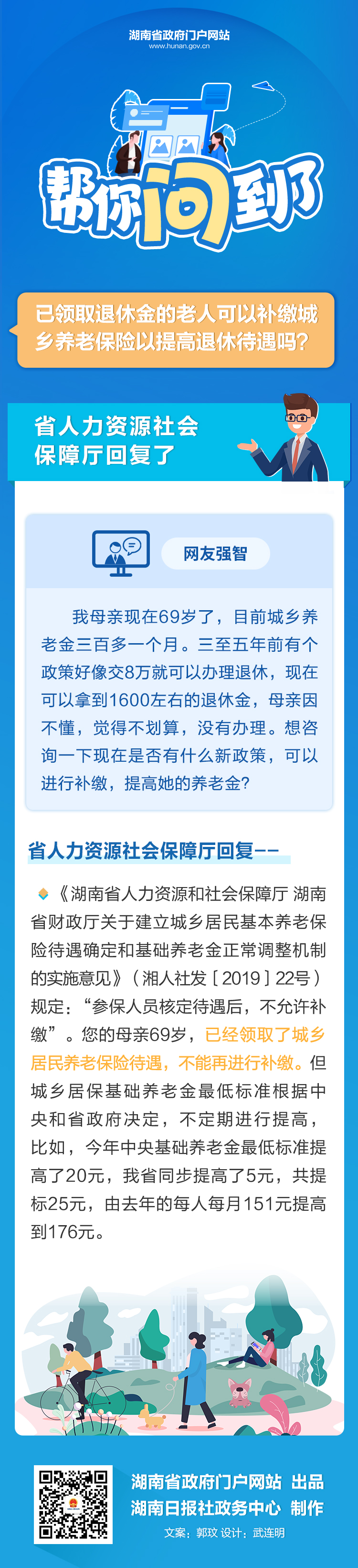 已領取退休金的老人可以補繳城鄉養老保險以提高退休待遇嗎?幫你問到了! 麻陽苗族自治縣人民政府 https://www.zwgsc.com 發布時間: 2025-11-03 14:12 【字體:大 小】 分享到 來源:湖南省政府門戶網站 作者: