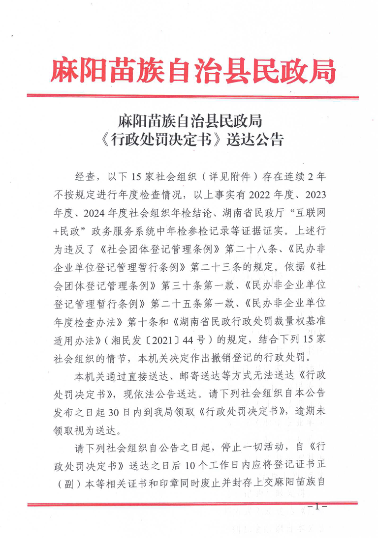 麻陽苗族自治縣民政局《行政處罰決定書》送達公告