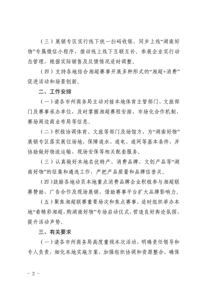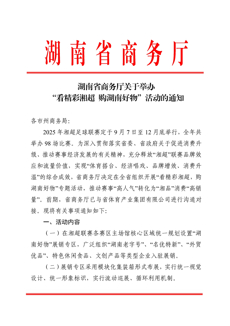 湖南省商務廳關於舉辦“看精彩湘超 購湖南好物”活動的通知 麻陽苗族自治縣人民政府 https://www.zwgsc.com 發布時間: 2025-08-26 16:08 【字體:大 小】 分享到 來源:麻陽縣商科工信局 作者: