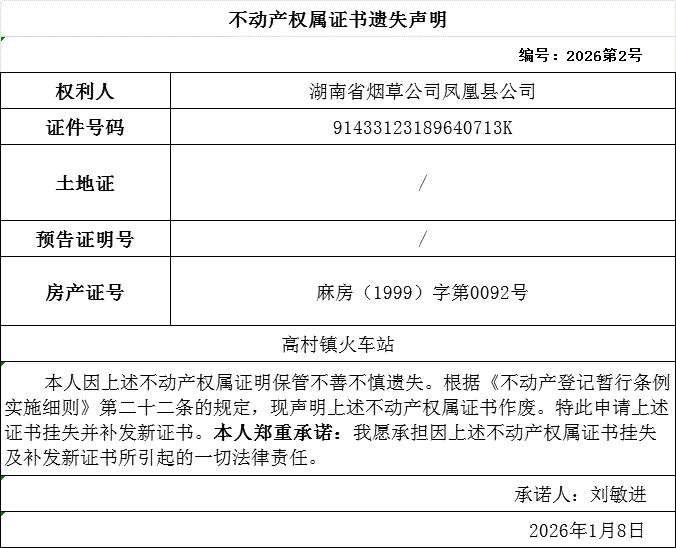 不動產權屬證書遺失聲明(湖南省煙草公司鳳凰縣公司) 麻陽苗族自治縣人民政府 https://www.zwgsc.com 發布時間: 2026-01-09 08:44 【字體:大 小】 分享到 來源:麻陽縣自然資源局 作者: