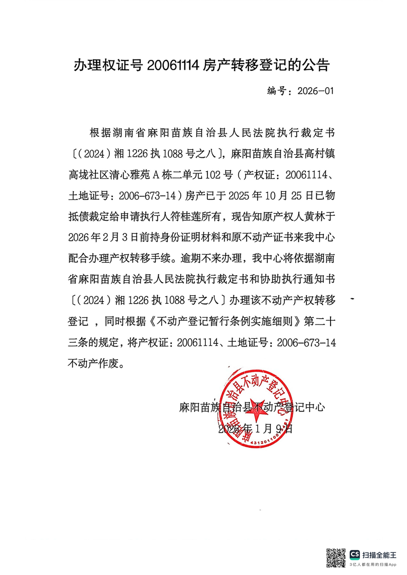 辦理權證號20061114房產轉移登記公告 麻陽苗族自治縣人民政府 https://www.zwgsc.com 發布時間: 2026-01-09 16:13 【字體:大 小】 分享到 來源:麻陽縣自然資源局 作者: