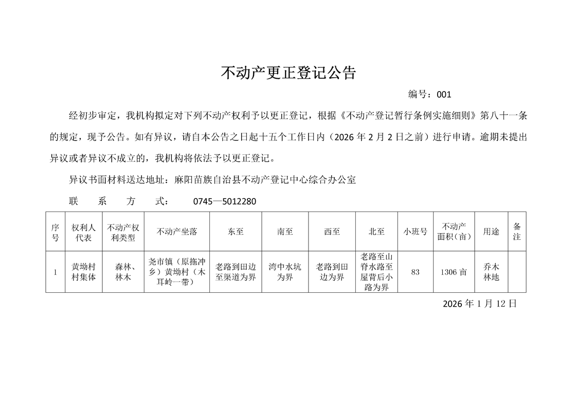 林權不動產更正登記公告(黃坳村村集體) 麻陽苗族自治縣人民政府 https://www.zwgsc.com 發布時間: 2026-01-12 14:58 【字體:大 小】 分享到 來源:麻陽縣自然資源局 作者: