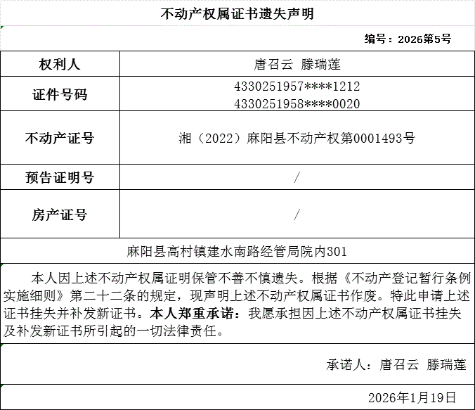 不動產權屬證書遺失聲明(唐召雲 滕瑞蓮) 麻陽苗族自治縣人民政府 https://www.zwgsc.com 發布時間: 2026-01-19 15:52 【字體:大 小】 分享到 來源:麻陽縣自然資源局 作者:
