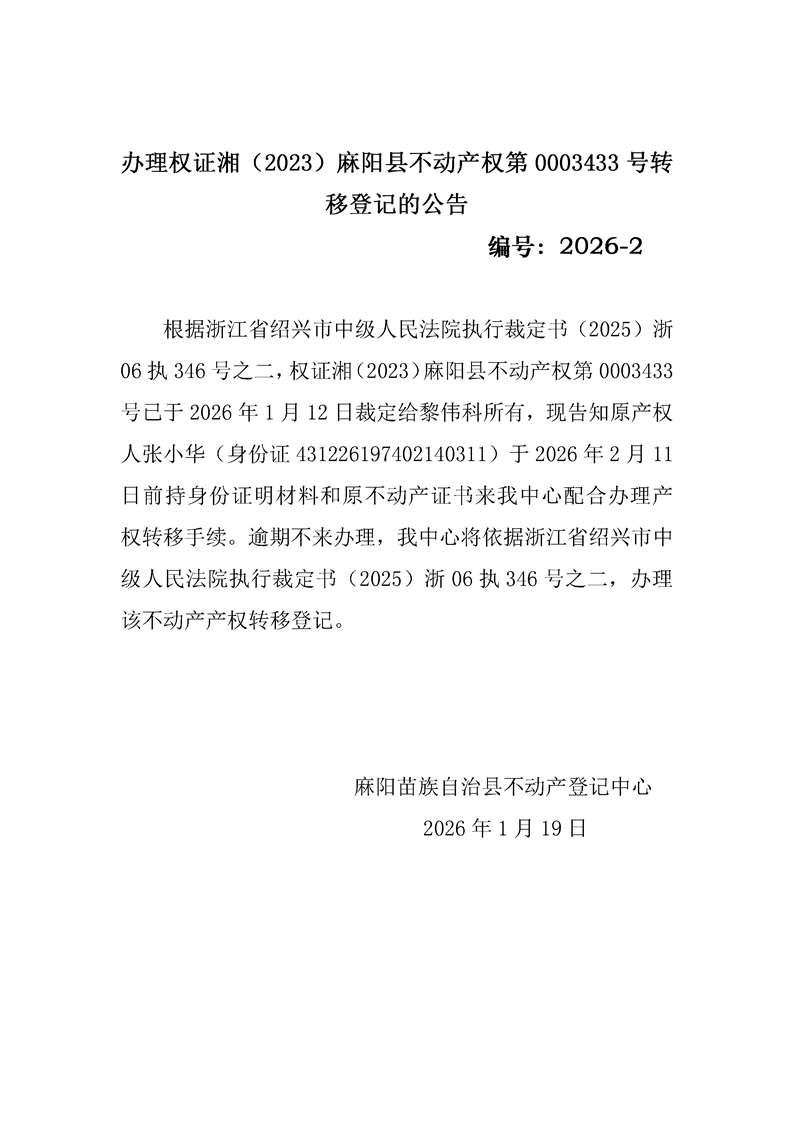 辦理張小華權證號0003433號轉移登記的公告 麻陽苗族自治縣人民政府 https://www.zwgsc.com 發布時間: 2026-01-19 15:50 【字體:大 小】 分享到 來源:麻陽縣自然資源局 作者: