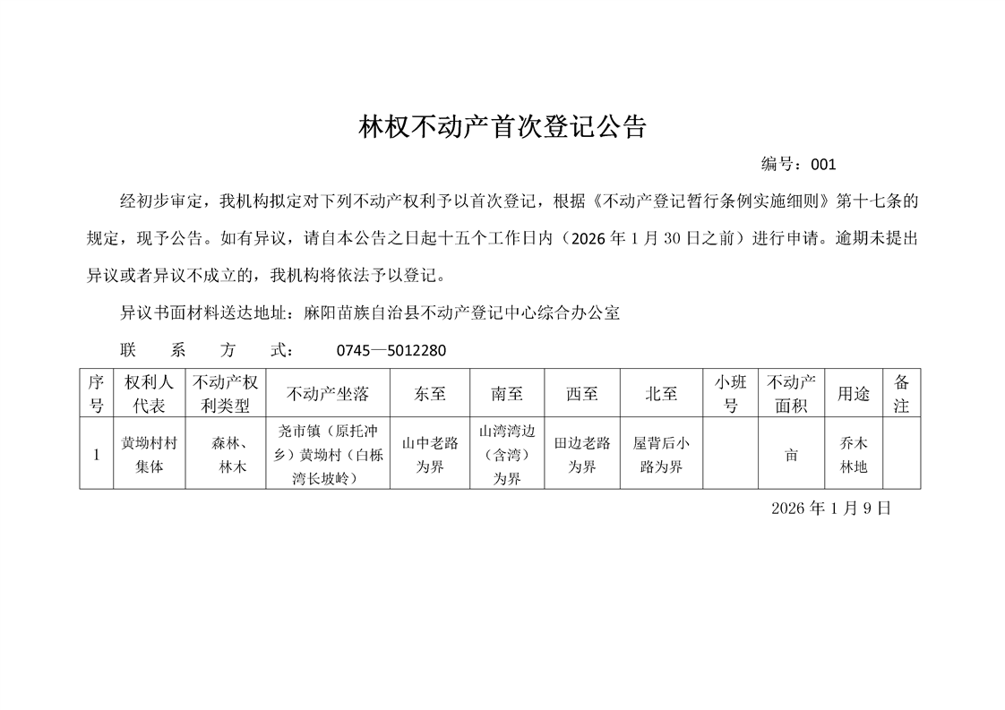 林權不動產首次登記公告(黃坳村集體) 麻陽苗族自治縣人民政府 https://www.zwgsc.com 發布時間: 2026-01-09 14:58 【字體:大 小】 分享到 來源:麻陽縣自然資源局 作者: