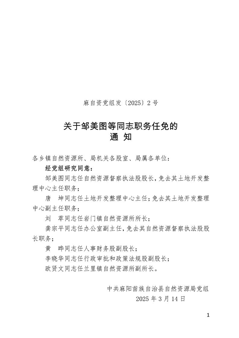 關於鄒美圖等同誌職務任免的通知 麻陽苗族自治縣人民政府 https://www.zwgsc.com 發布時間: 2025-03-28 11:09 【字體:大 小】 分享到 來源:麻陽縣自然資源局 作者: