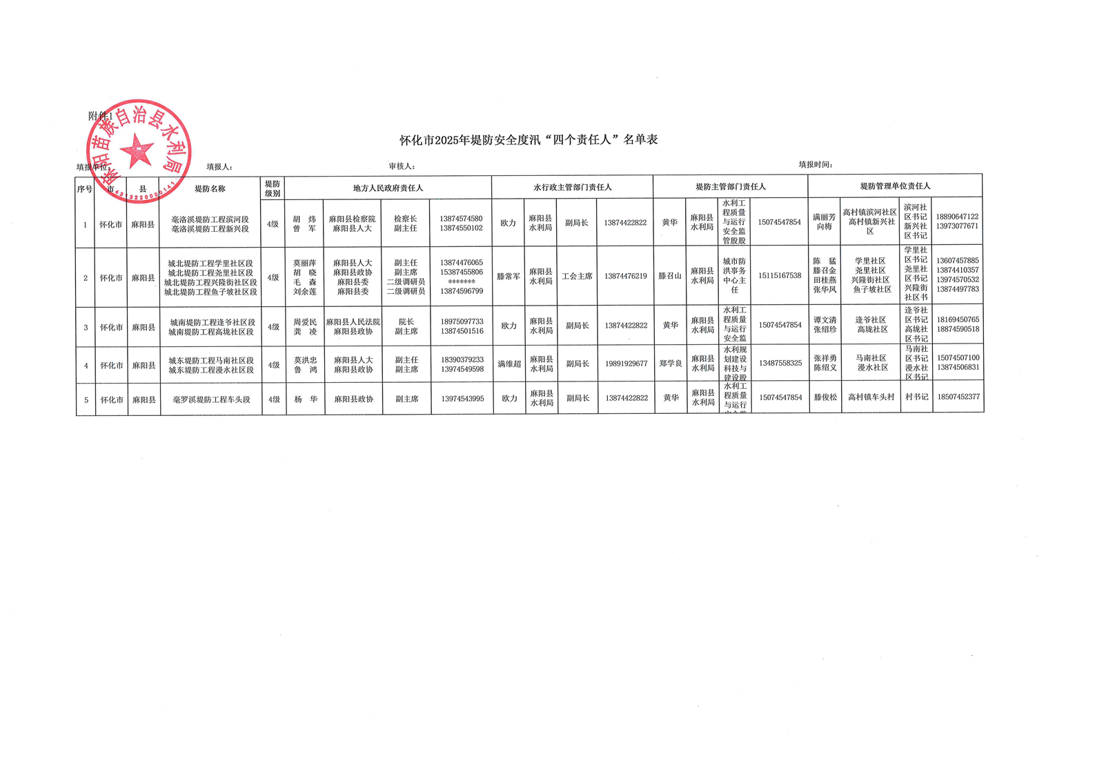 懷化市2025年堤防安全度汛“四個責任人”名單表 麻陽苗族自治縣人民政府 https://www.zwgsc.com 發布時間: 2025-04-28 09:50 【字體:大 小】 分享到 來源:麻陽縣水利局 作者: