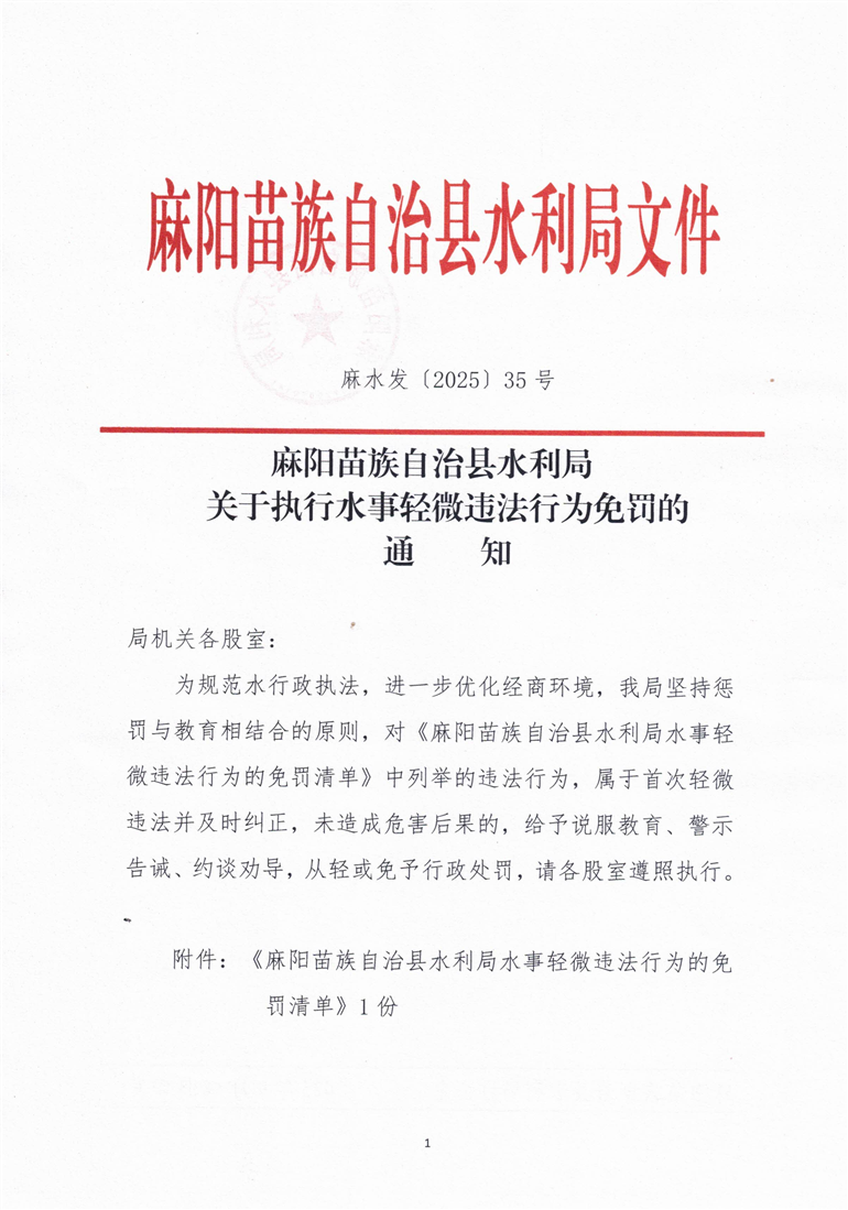 麻陽苗族自治縣水利局關於執行水事輕微違法行為免罰的通知 麻陽苗族自治縣人民政府 https://www.zwgsc.com 發布時間: 2025-09-18 11:08 【字體:大 小】 分享到 來源:麻陽縣水利局 作者:
