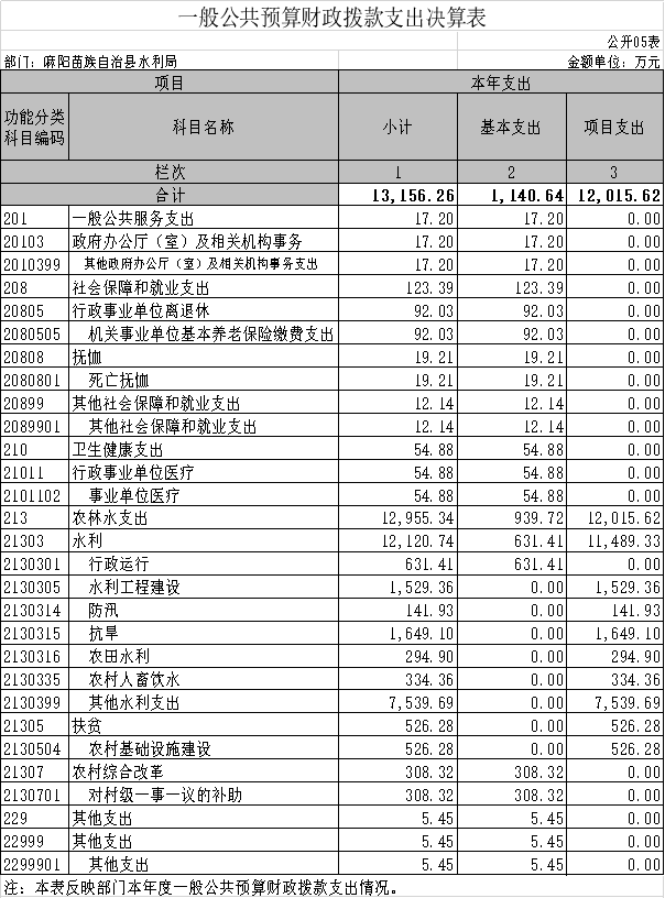 根據《麻陽苗族自治縣財政局關於編製2019年部門預算的通知》(麻財績〔2018〕10號)的安排,2019年支出預算1308.95萬元,其中:一般公共服務支出823.83萬元、社會保障和就業支出139.88萬元、醫療衛生支出48.38萬元、住房保障支出63.86萬元;對村級一事一議補助的水利建設資金項目支出233萬元。單位自收自支及差額人員共計13人,按文件規定每人每年人員公用經費為6.5萬元,共計84.5萬元;全額人員68人,按文件規定每人每年人員公用經費為1.8萬元,合計122.4萬元;項目支出中水利項目前期工作經費100萬元,防汛抗旱工作經費75萬元,基層防汛抗旱體係運行維護經費38萬元,梅水橋排澇站經費20萬元,合計233萬元。
