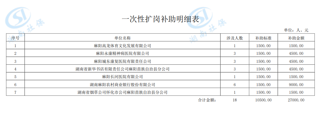 一次性擴崗補助發放公示 麻陽苗族自治縣人民政府 https://www.zwgsc.com 發布時間: 2026-01-15 08:44 【字體:大 小】 分享到 來源:麻陽縣人力資源和社會保障局 作者: