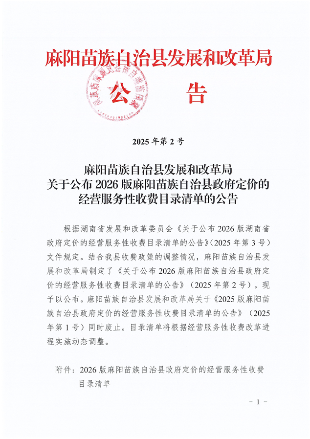 關於公布2026版麻陽苗族自治縣政府定價的經營服務性收費目錄清單的公告 麻陽苗族自治縣人民政府 https://www.zwgsc.com 發布時間: 2025-11-28 09:14 【字體:大 小】 分享到 來源:麻陽縣發展和改革局 作者: