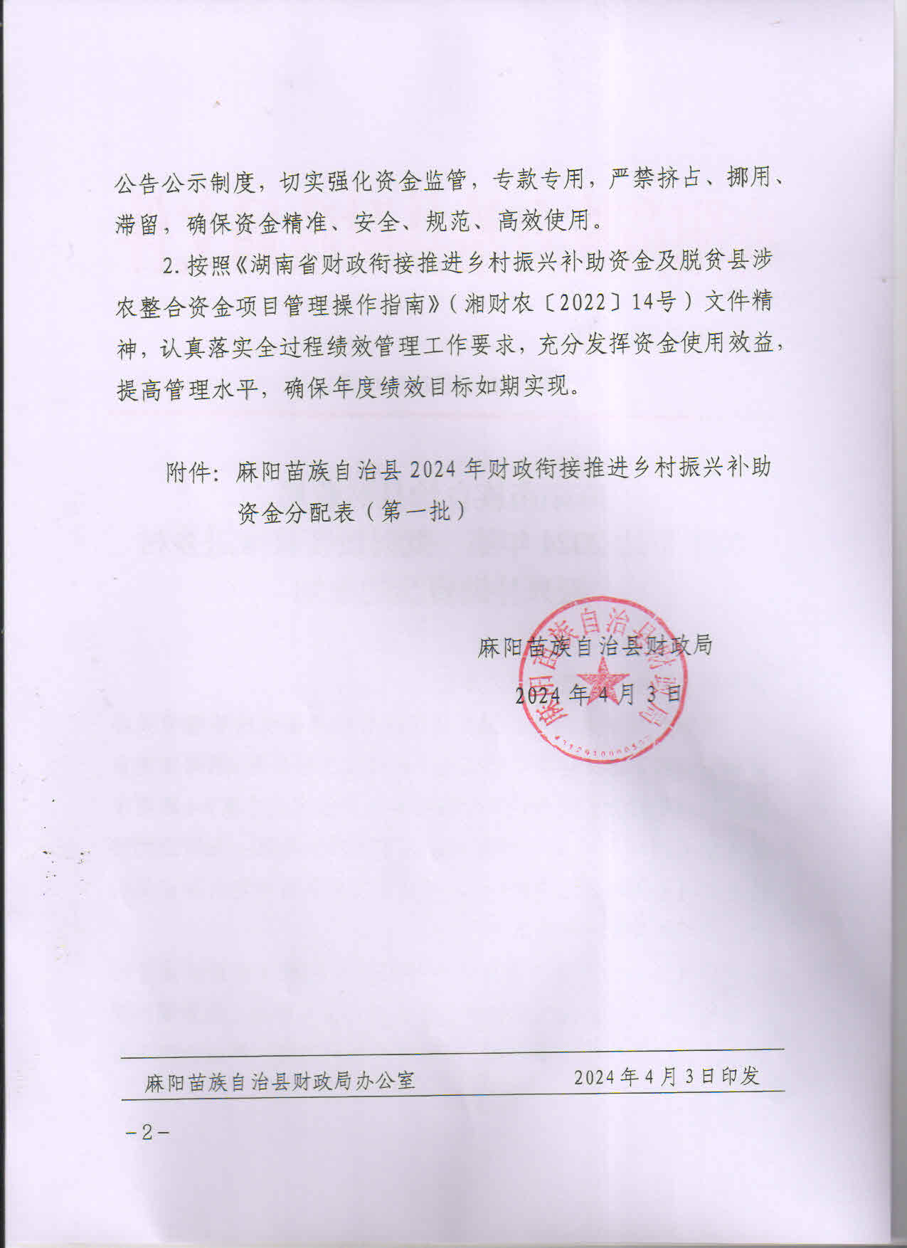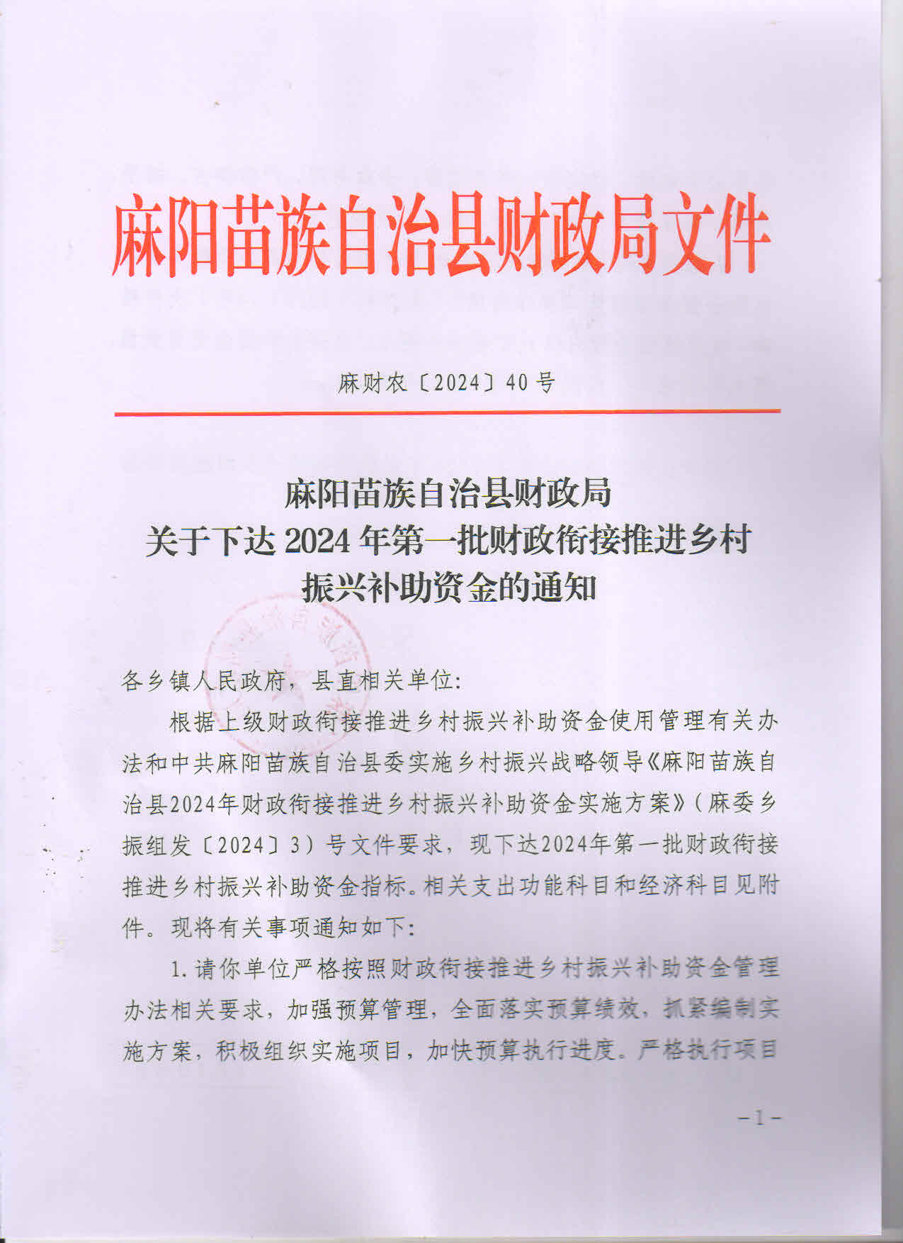 麻陽苗族自治縣財政局關於下達2024年第一批財政銜接推進鄉村振興補助資金的通知