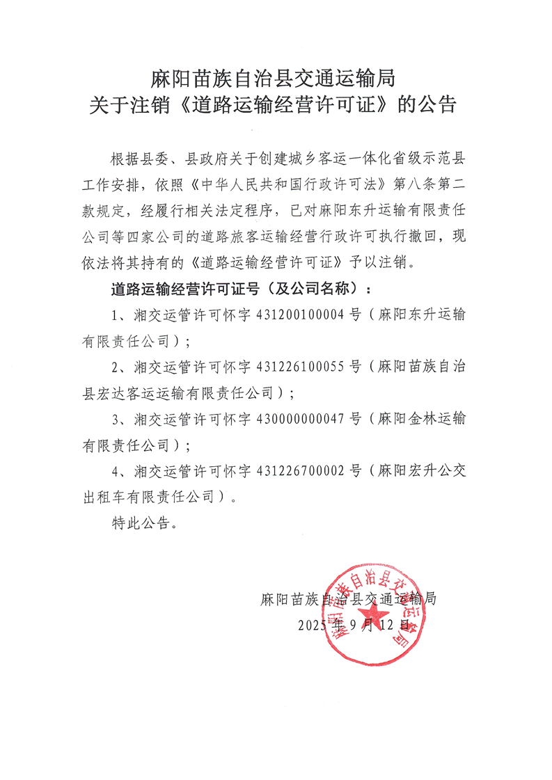 關於注銷《道路運輸經營許可證》的公告