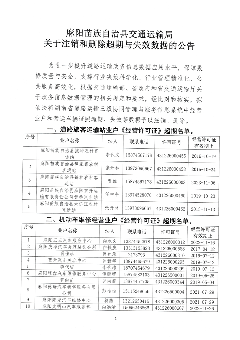 麻陽苗族自治縣交通運輸局關於注銷和刪除超期與失效數據的公告