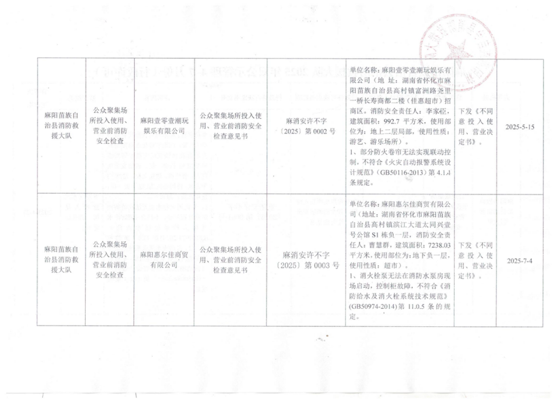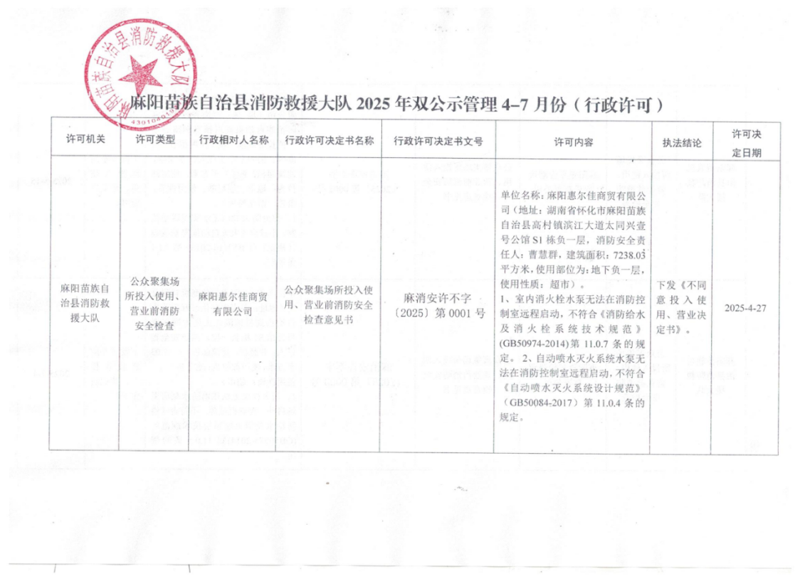 麻陽苗族自治縣消防救援大隊2025年雙公示管理4-7月份(行政許可)