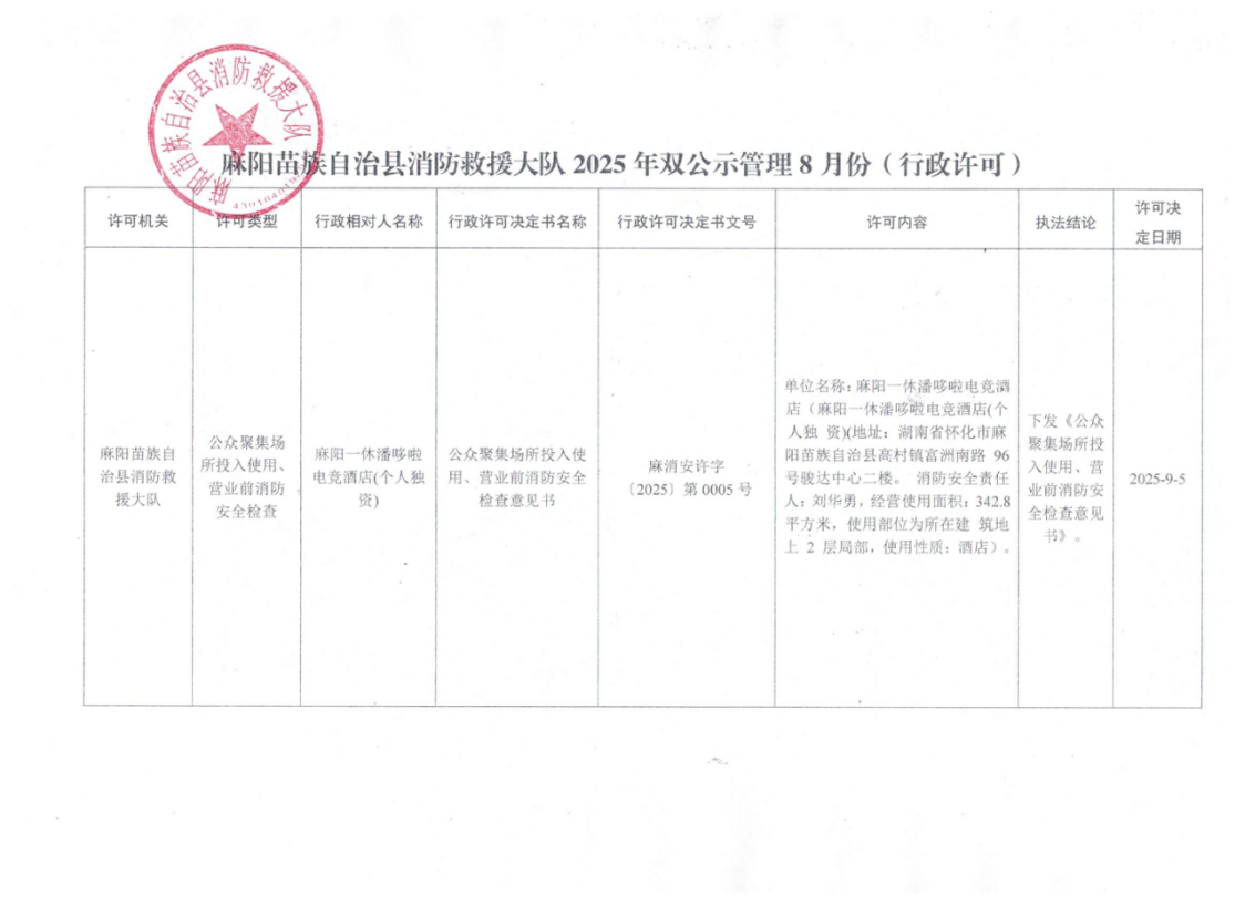 麻陽苗族自治縣消防救援大隊2025年雙公示管理8月份(行政許可)