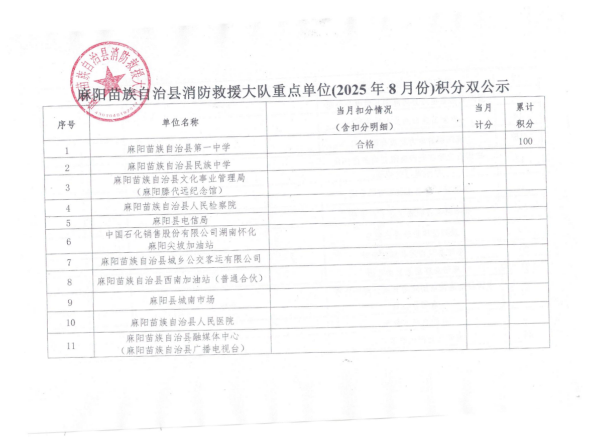 麻陽苗族自治縣消防救援大隊重點單位(2025年8月份)積分雙公示 麻陽苗族自治縣人民政府 https://www.zwgsc.com 發布時間: 2025-09-05 16:06 【字體:大 小】 分享到 來源:麻陽縣應急管理局 作者: