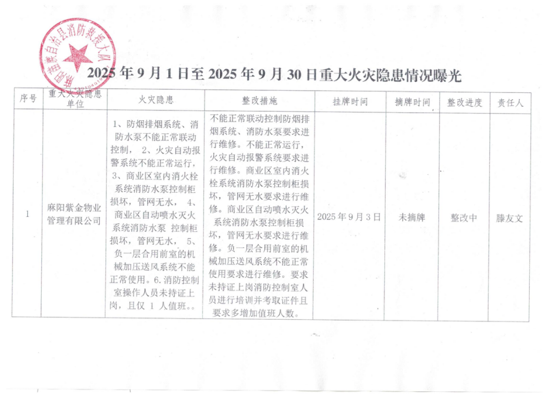 2025年9月1日至2025年9月30日重大火災隱患情況曝光 麻陽苗族自治縣人民政府 https://www.zwgsc.com 發布時間: 2025-09-05 16:13 【字體:大 小】 分享到 來源:麻陽縣應急管理局 作者: