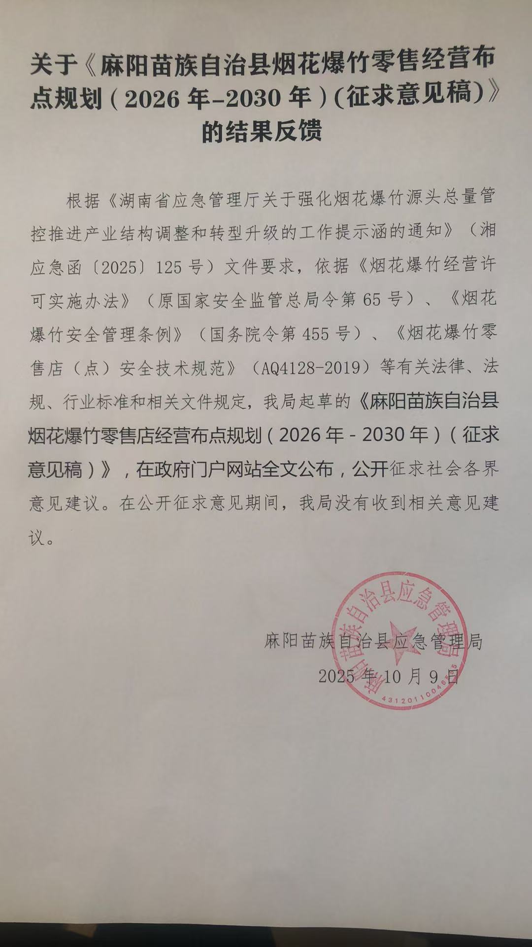 關於《麻陽苗族自治縣煙花爆竹零售經營布點規劃(2026年-2030年)(征求意見稿)》的結果反饋