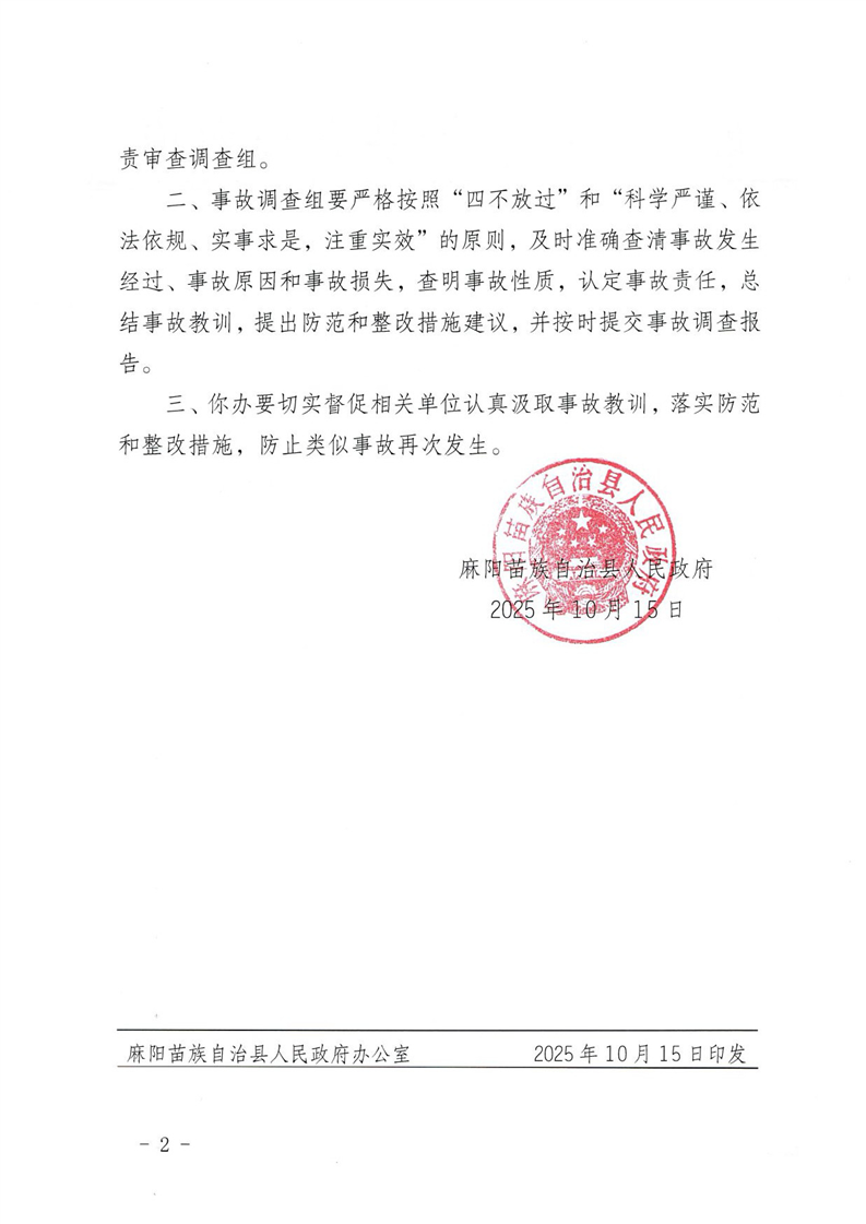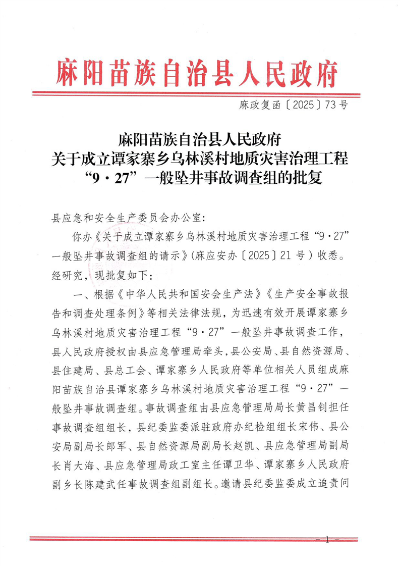 麻陽縣人民政府關於成立9.27一般事故墜井事故調查組的批複 麻陽苗族自治縣人民政府 https://www.zwgsc.com 發布時間: 2025-10-20 11:31 【字體:大 小】 分享到 來源:麻陽縣應急管理局 作者: