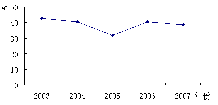 麻陽農業具備相當的規模和良好的基礎,特別是柑桔產業在省內外頗具名氣。近年來,縣委、縣政府出台一係列相關文件政策,從農業生產服務方式創新的基本原則、主要途徑、激勵機製、組織領導等方式提出若幹具體意見,加快現代農業發展,推進興農富民步伐。截至2008年,糧食種植麵積達34.2萬畝,總產量達11.8萬噸,全年柑桔總產量達到35萬噸,全縣完成農業總產值12.2億元,比2007年增長5.9%。但從第一產業對GDP增長的貢獻率來看,盡管對財政的貢獻率從2003年的12.7%持續增長到2005年的32.5%,但隨後又出現逐漸衰減的趨勢,截至2007年,第三產業對財政的貢獻率已經降低到19.4%(圖2-1)。