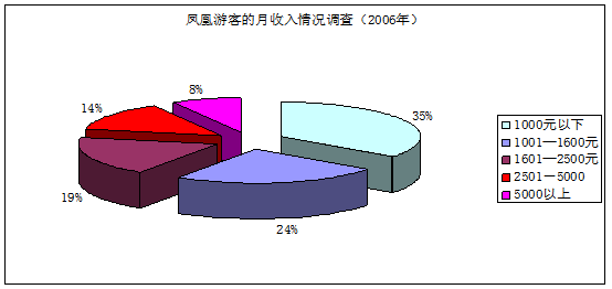 鳳凰遊客中月收入2500元以上的中產階層在整個遊客群體中占據了22%的份額,這與旅遊花費統計中消費較高的人數比率相當,這一部分客源是麻陽旅遊的重點市場。
