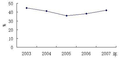 長期以來,麻陽縣委、縣政府高度重視工業發展。大力招商引資,把工業作為招商引資的重點,不斷擴張工業經濟總量,增強工業經濟實力。截至2008年,全縣完成工業總產值17.83億元, 比2007年增長25.1%;其中規模以上工業實現總產值14億元,增長31.9%。實現工業增加值6.14億元,增長21.2%;其中民營工業實現增加值5.4億元,增長20%,重點企業實繳稅金達到3524萬元。從2003年到2007年,工業增加值由19562萬元增加到41872萬元,2007年工業占GDP比重達23.7%,五年來以平均每年增長16.4%的速度發展,工業對GDP增長的貢獻率由2003年的23.4%增加到2007年的37.3%(圖2-3)。一係列數據表明,麻陽縣工業化進程取得初步成效,但從以工業為代表的第二產業對縣經濟