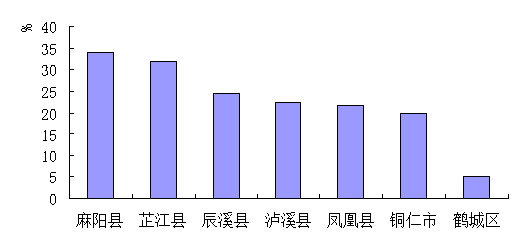 區),而比鶴城區、芷江縣、辰溪縣、銅仁市、瀘溪縣分別低2.5、5.6、8.3、10.7和24.9個百分點,比重明顯低於周邊縣市的平均水平(圖2-4)。
