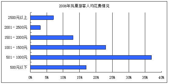 鳳凰遊客大部分屬於觀光型遊客,人均花費較低,大部分集中在1500元以下。但消費1500元以上的遊客群體仍然占據了四分之一的份額。遊客體現出的消費層次仍然有待於進一步進行市場細分。