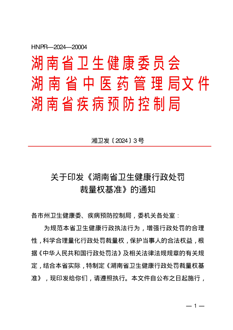 湖南省衛生健康委員會 湖南省中醫藥管理局 湖南省疾病預防控製局關於印發《湖南省衛生健康行政處罰裁量權基準》的通知