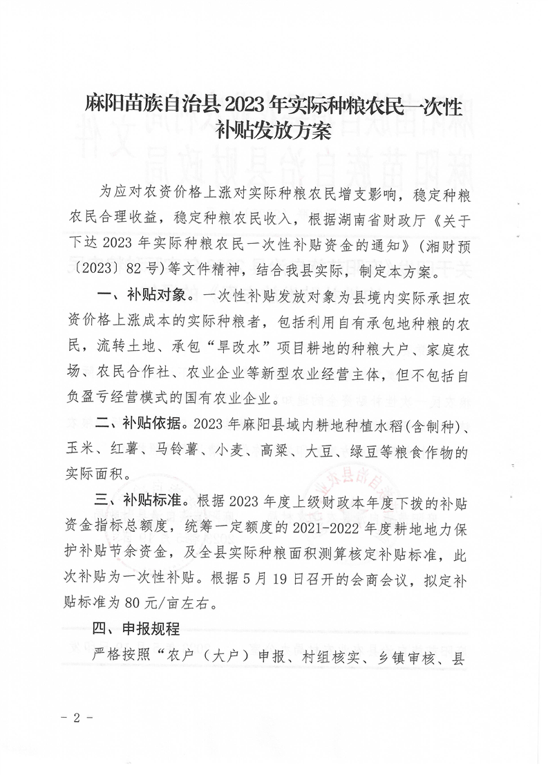 關於印發《麻陽苗族自治縣2023年實際種糧農民一次性補貼發放方案》的通知 麻陽苗族自治縣人民政府 https://www.zwgsc.com 發布時間: 2023-05-29 10:14 【字體:大 小】 分享到 來源:麻陽縣農業農村局 作者: