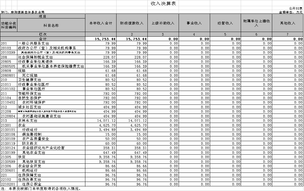2019 年度收入合計15753.44萬元(其中一般公共預算財政撥款15348.46萬元、政府性基金預算財政撥款收入404.99萬元),上年結轉和結餘3320.15萬元,收入總計19073.59萬元;支出總計15850.39萬元,年末結轉和結餘3223.2萬元。與2018年相比,總收入增加5835.56萬元,增長59%,總支出增加8566.42萬元,增長118%,主要原因是涉農整合、上級專項資金收支增加,同比上年收支決算比重較大。