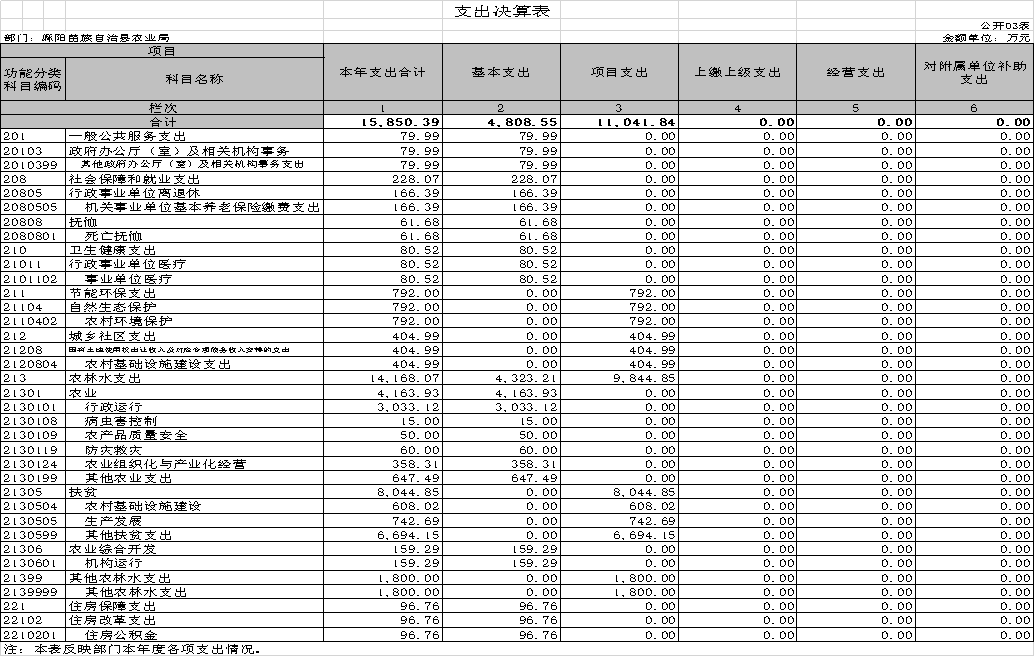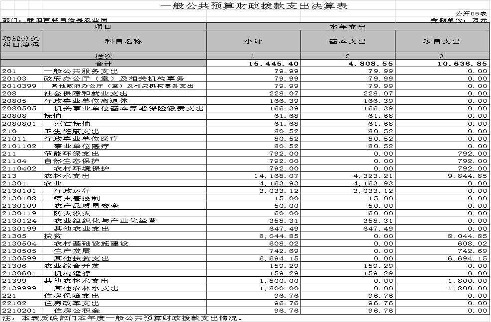 5、農林水支出(農業-行政運行3033.12萬元、農業-病蟲害控製15萬元、農產品質量安全50萬元、農業-防災救災60萬元、農業-農業組織化與產業化經營358.31萬元、其他農業支出647.49萬元,扶貧-農村基礎設施建設608.02萬元、扶貧-生產發展742.69萬元、扶貧-其他扶貧支出6694.15萬元,農業綜合開發-機構運行159.29萬元、其他農林水支出1800萬元)