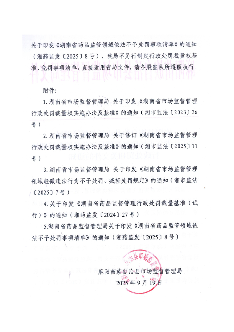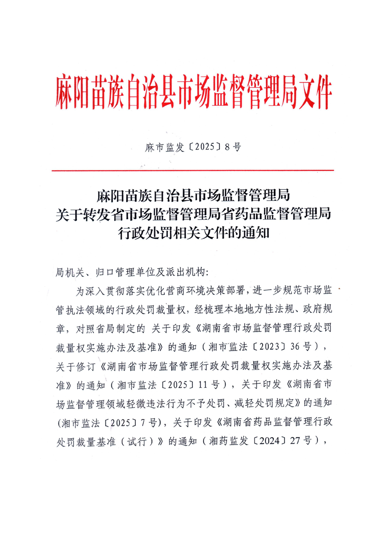 關於轉發省市場監督管理局省藥品監督管理局行政處罰相關文件的通知 麻陽苗族自治縣人民政府 發布時間: 2025-09-26 10:54 【字體:大 小】 相關附件 展開 湖南省市場監督管理局關於印發《湖南省市場監督管理行政處罰裁量權實施辦法及基準》的通知.pdf 湖南省市場監督管理局關於修訂《湖南省市場監督管理行政處罰裁量權實施辦法及基準》的通知.pdf 湖南省市場監督管理局關於印發《湖南省市場監督管理領域輕微違法行為不予處罰、減輕處罰規定》的通知.pdf 關於印發《湖南省藥品監督管理行政處罰裁量基準(試行)》的通知.pdf 湖南省藥品監督管理局關於印發《湖南省藥品監管領域依法不予處罰事項清單》的通知.pdf 分享到 來源:麻陽縣市場監督管理局 作者: