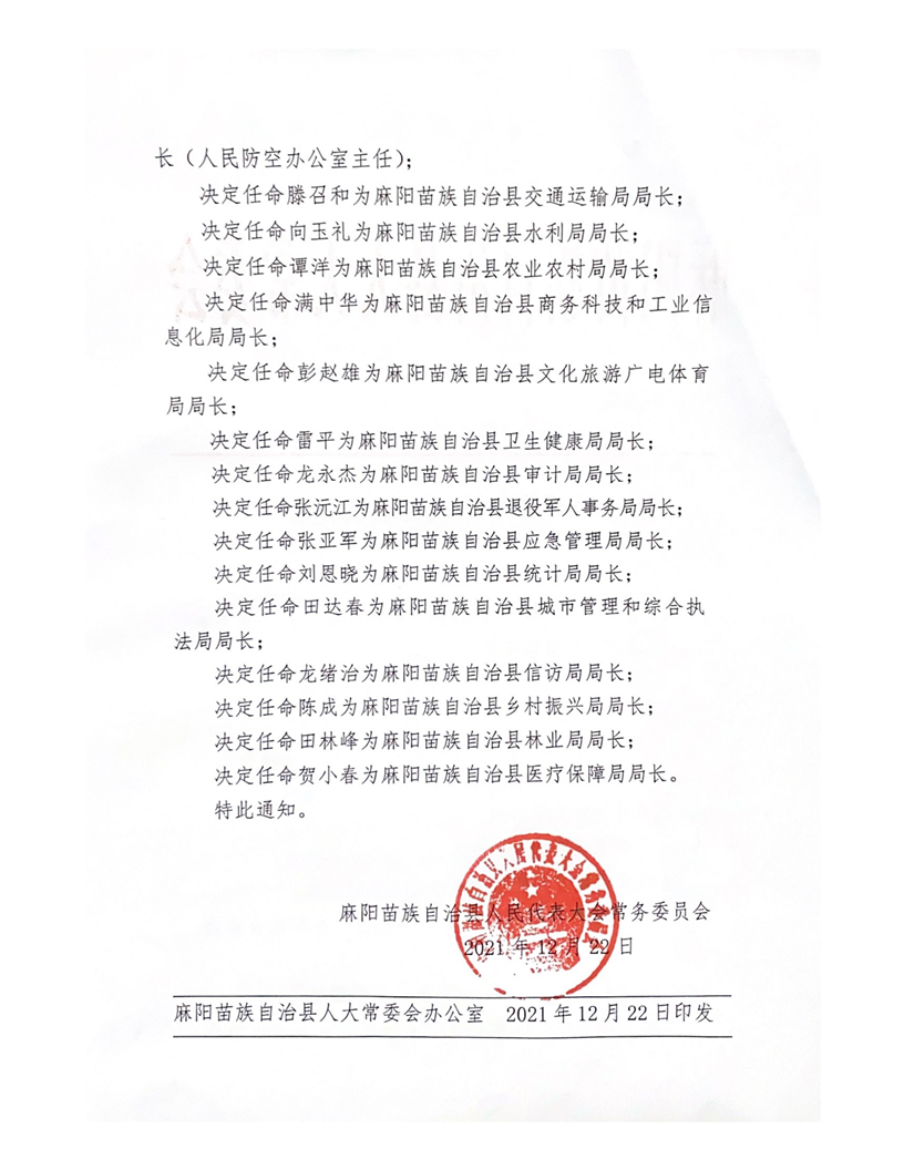 關於石峰等的決定任命通知 麻陽苗族自治縣人民政府 https://www.zwgsc.com 發布時間: 2022-01-06 10:05 【字體:大 小】 分享到 來源:麻陽苗族自治縣人大常委會 作者: