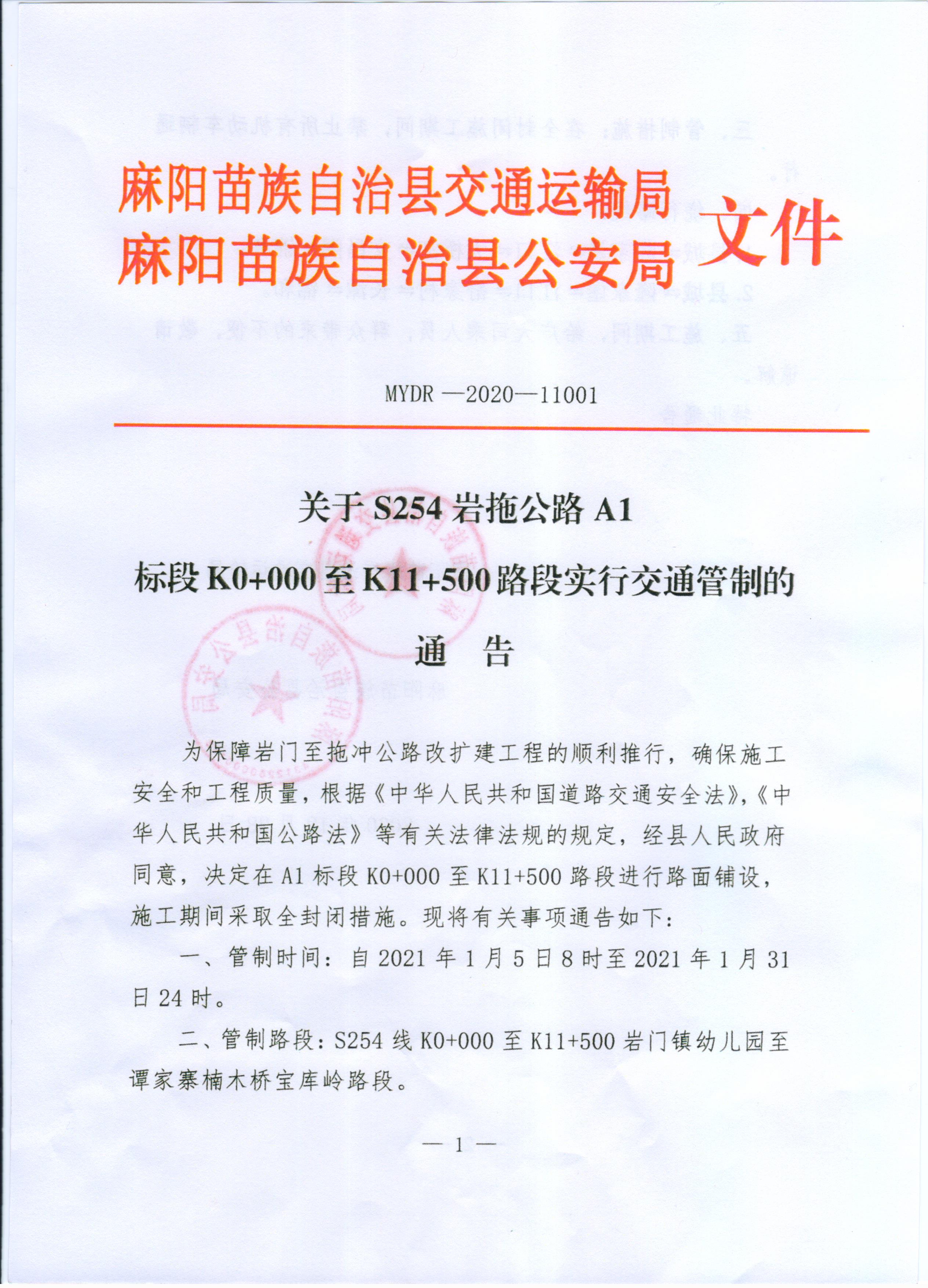 關於S254岩拖公路A1標段K0+000至K11+500路段實行交通管製的通告