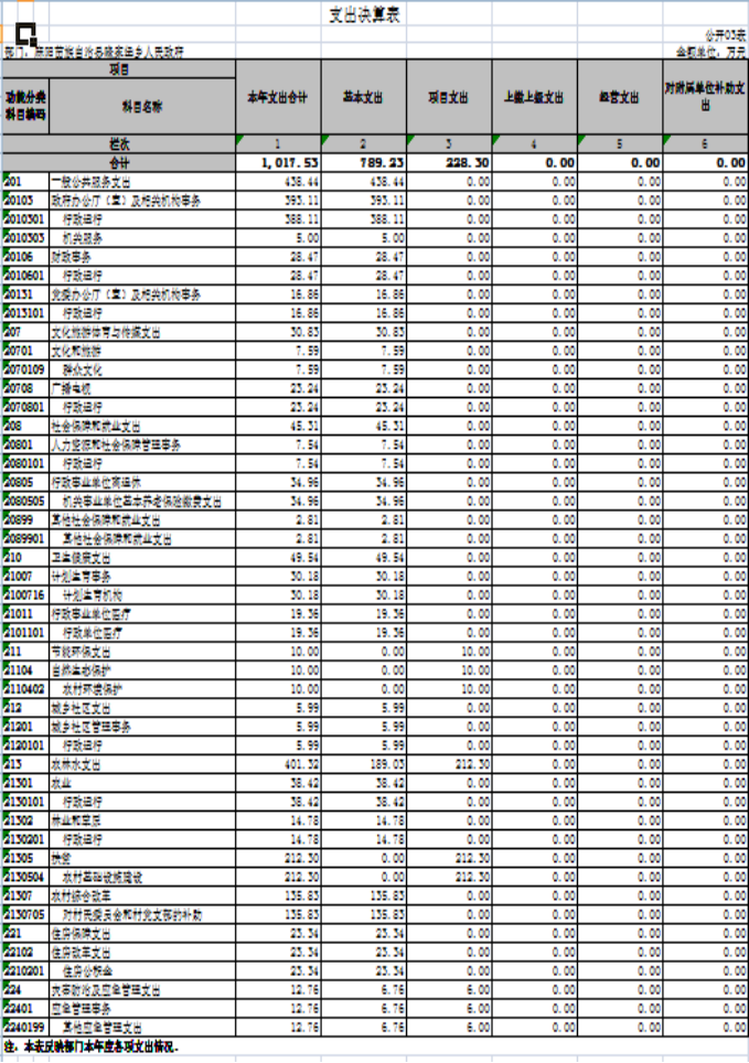 2019年度財政撥款支出1017.53萬元,占本年支出合計的100%,與2018年相比,財政撥款支出增加90.96萬元,增長9.82%,主要原因是;扶貧攻堅等日常開支略有增加。