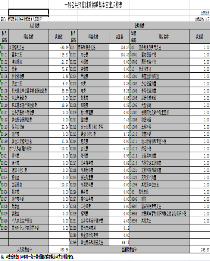 2019年度財政撥款基本支出789.23萬元,其中:人員經費530.66萬元,占基本支出的67.24%,主要包括基本工資129.31萬元、津貼補貼121.37萬元、獎金73.47萬元、夥食補助費3.48萬元,績效工資6.14萬元,機關事業單位基本養老保險繳費35.99萬元, 職工基本醫療保險繳費19.84萬元,住房公積金23.34萬元,其他工資福利支出17.56萬元,生活補助100.17萬元;公用經費258.57萬元,占基本支出的32.76%,主要包括辦公費154.32萬元、水費0.38萬元、電費5.25萬元、郵電費0.85萬元、取暖費0.59萬元、差旅費7.45萬元,維修(護)費3.72萬元,會議費6.3萬元,培訓費0.96萬元,公務接待費0.82萬元,工會經費4萬元,公務用車運行維護費4.68萬元,其他交通費用0.12萬元,其他商品和服務支出69.14萬元。