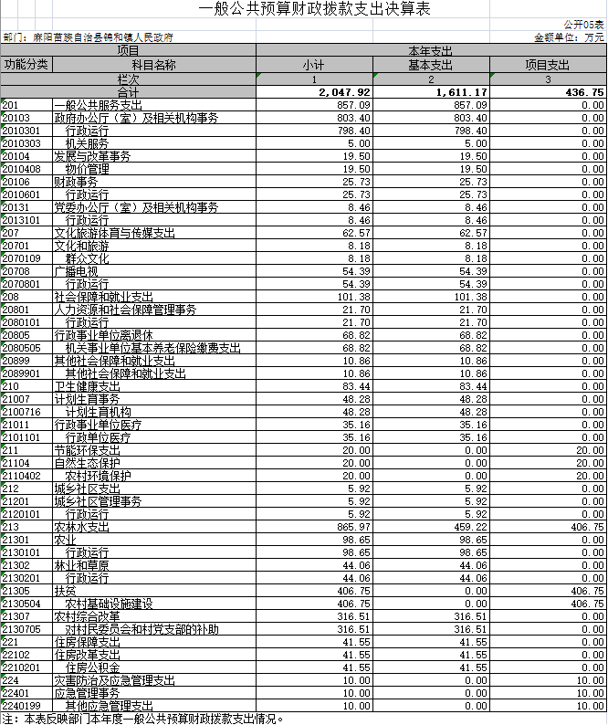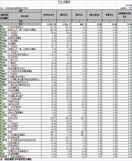 2019年度財政撥款支出2047.92萬元,主要用於以下方麵:一般公共服務支出857.09萬元,占41.85%;文化體育與傳媒支出62.57萬元,占3.06%;社會保障和就業支出為101.38萬元,占4.95%;衛生健康支出83.44萬元,占4.07%;節能環保支出20萬元,占0.98%;城鄉社區支出5.92萬元,占0.29%;農林水支出865.97萬元,占42.29%;災害防治及應急管理支出10萬元,占0.49%;住房保障支出41.55萬元,占2.03%。