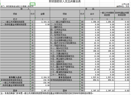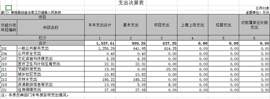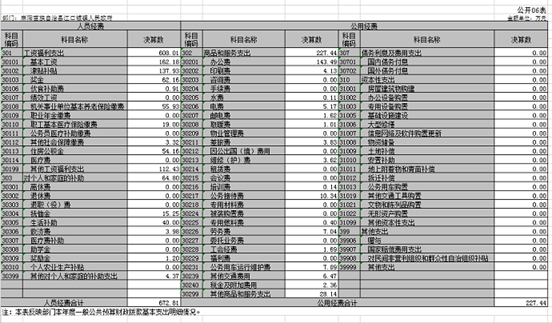 2018年決算一般公共預算財政撥款支出總計1537.61萬元。其中一般公共服務支出1256.29萬元(包括基本支出641.95萬元,項目支出614.35萬元);公共安全支出0.4萬元;文化體育與傳媒支出6.39萬元;醫療衛生與計劃生育支出22.31萬元;節能環保支出15萬元;城鄉社區支出10.83萬元;農林水支出186.22萬元;資源勘探信息等支出13.09萬元;住房保障支出27.08萬元。2017年財政支出總計958.11萬元。其中一般公共服務支出545.81萬元,文化體育與傳媒支出32.78萬元,社會保障和就業支出76.68萬元,醫療衛生與計劃生育支出69.87萬元,節能環保支出15萬元,城鄉社區支出5.37萬元,農林水支出187.48萬元,住房保障支出25.13萬元。