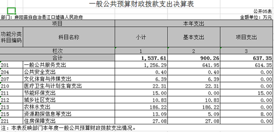2018年財政支出總計1537.61萬元。其中一般公共服務支出1256.29萬元(包括基本支出641.95萬元,項目支出614.35萬元);公共安全支出0.4萬元;文化體育與傳媒支出6.39萬元;醫療衛生與計劃生育支出22.31萬元;節能環保支出15萬元;城鄉社區支出10.83萬元;農林水支出186.22萬元;資源勘探信息等支出13.09萬元;住房保障支出27.08萬元。
