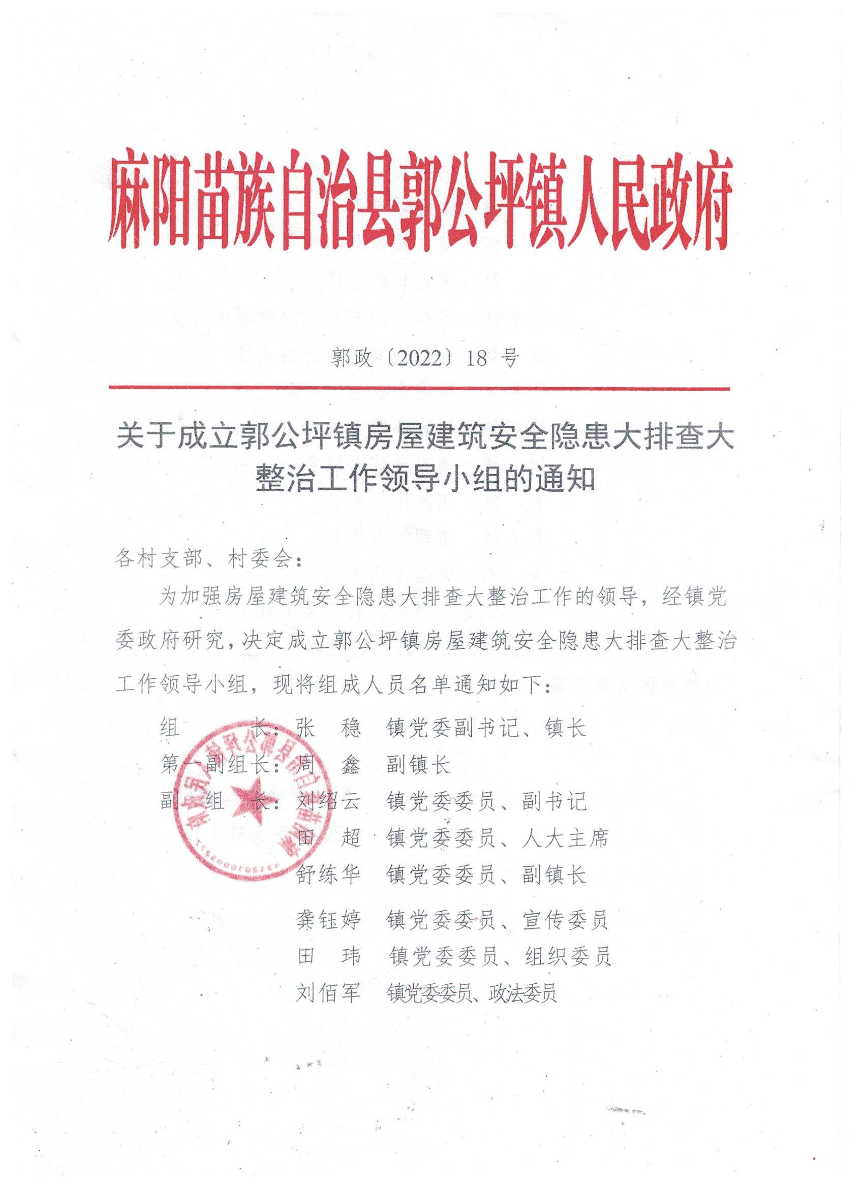 關於成立郭公坪鎮房屋建築安全隱患大排查大整治工作領導小組的通知 麻陽苗族自治縣人民政府 https://www.zwgsc.com 發布時間: 2022-05-17 14:20 【字體:大 小】 分享到 來源:麻陽縣郭公坪鎮 作者: